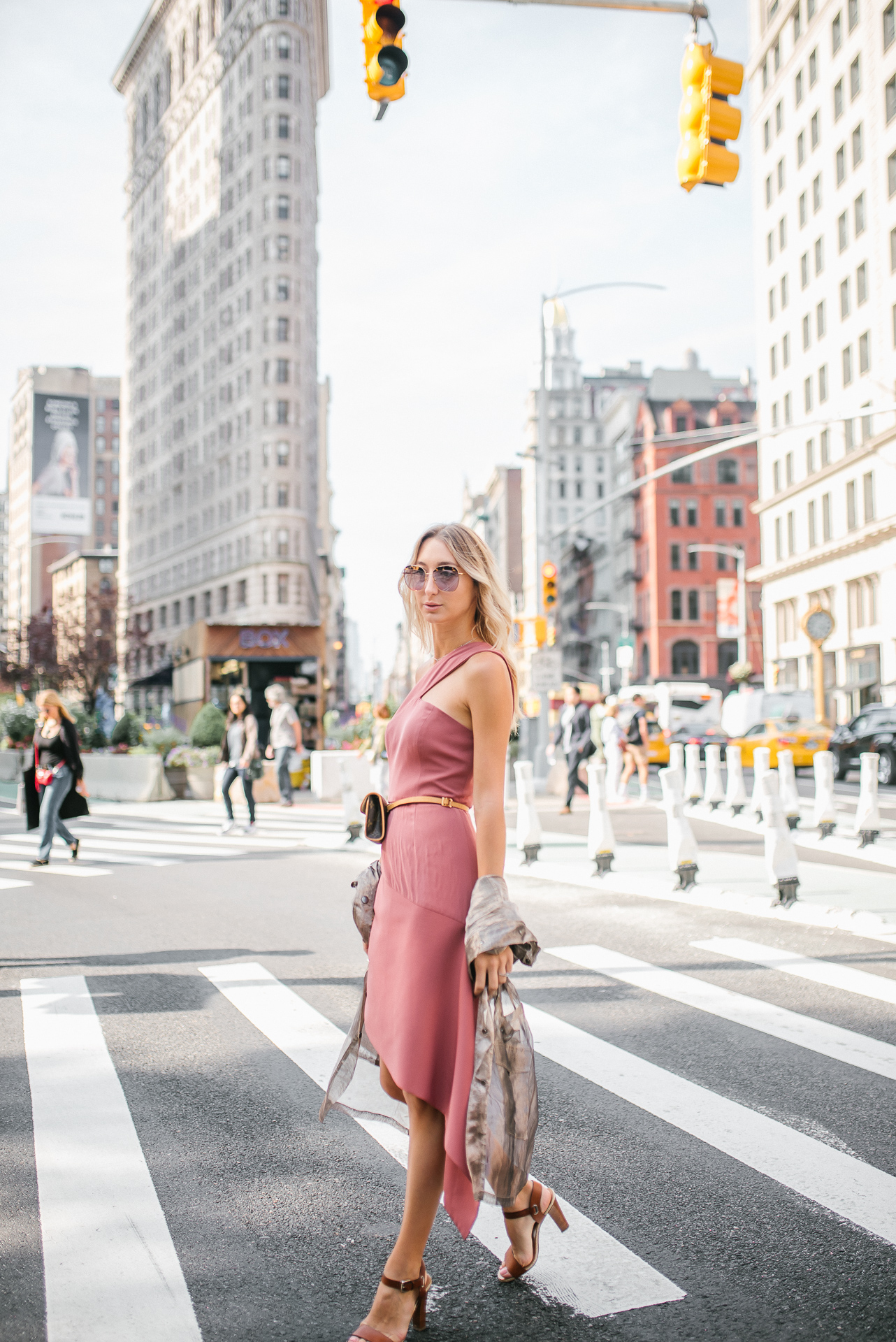 I love the darker blush tone of this asymmetrical dress from Keepsake via Rent the Runway. I paired it with the wonderful sheer duster from Inclán for a very current look. This duster is such a must-have item from them!